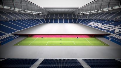 Sener da una vuelta al césped retráctil del Real Madrid y lanza una cubierta que se esconde tras las gradas