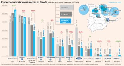 El año del automóvil en España ha tenido claramente dos caras. La parte positiva fue el notable aumento de las ventas de coches nuevos, acercando al país a sus cifras de matriculaciones prepandemia (siendo el alumno aventajado de los grandes de Europa en esta materia); pero por otro ha cerrado un segundo ejercicio consecutivo de caída de la producción. Según los datos recopilados por este periódico de las propias empresas y fuentes del sector, las fábricas españolas ensamblaron el año pasado más de 2,27 millones de unidades, lo que supone un descenso del 4,3% respecto a 2024. A falta de las cifras oficiales que Anfac, la patronal nacional de automovilísticas, publicará dentro de unas semanas, las plantas nacionales se alejan un poco más de las 2,82 millones de unidades ensambladas en 2019, una cifra con la que ya hay una diferencia del 19,5%.