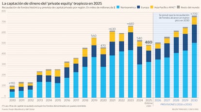 El capital privado (private equity, en inglés) cada vez es más accesible para los inversores con participaciones desde 10.000 euros. Los vehículos evergreen –permanentemente abiertos y que cuentan con ventanas de liquidez– han facilitado la llegada de los particulares. Están en los escaparates de la banca privada y también de gestoras clásicas, que han abierto esta espita con carteras más allá de los bonos y la renta variable. Con todo, el sector registró en 2025 su peor año en captaciones de dinero fresco desde el estallido de la Covid en 2020. Los fondos recibieron 480.000 millones de dólares (unos 410.000 millones de euros), según los datos preliminares de Preqin, la consultora propiedad de BlackRock especializada en activos alternativos.