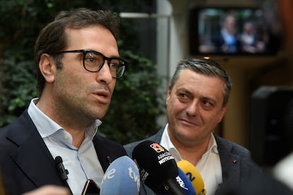 El ministro de Economía, Carlos Cuerpo (izquierda), se dirige a los medios de comunicación tras su encuentro con empresarios de la provincia en el Hotel Abba de Huesca este jueves. JAVIER BLASCO (EFE)