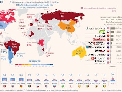 Los grandes beneficiados de esta particular fiebre del litio fueron las pocas manos que, según los datos de la Agencia Internacional de la Energía (AIE), están detrás de este mercado. En la producción por países, hay grandes reservas muy repartidas en diferentes zonas del mundo, pero en 2019, año con los datos más recientes en la AIE, Australia era responsable de la extracción de aproximadamente el 50% del litio, Chile de más del 25% y China de alrededor del 14%. En lo que a procesamiento para convertir el litio en hidróxido o carbonato se refiere, el gigante asiático era el líder indiscutible con más de un 50% de la capacidad mundial de “refinado”, seguido de Chile con aproximadamente un 30%. Si se atiende a la cuota de mercado por empresas, la estadounidense Albermale produjo el 24% del litio de todo el planeta, mientras que la chilena SQM Lithium aportó el 12% y la china Tianqi Lithium un 11%.
