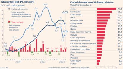 Pero sin duda uno de los datos que destaca de las cifras publicadas por el INE es el comportamiento de los alimentos y bebidas no alcohólicas, cuyos precios aumentan menos este mes que en abril de 2022. En marzo pasado la rúbrica alimentaria se frenó ligeramente, pero registró una tasa interanual del 16,5%, mientras que el dato conocido hoy se reduce hasta el 12,9% interanual.