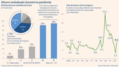 Tras la pandemia, el exceso de ahorro pudo ser movilizado por parte de las rentas altas al consumo, pero su efecto fue más bien un espejismo, indica Balado. “Puede que las rentas altas usaran ese ahorro forzoso realizado durante el confinamiento para adquirir bienes, como un coche o una casa, lo que fomenta el consumo. Las rentas altas tienen menor propensión a consumir, pero cuando gastan lo hacen en productos que tiran más de la demanda”, explica.