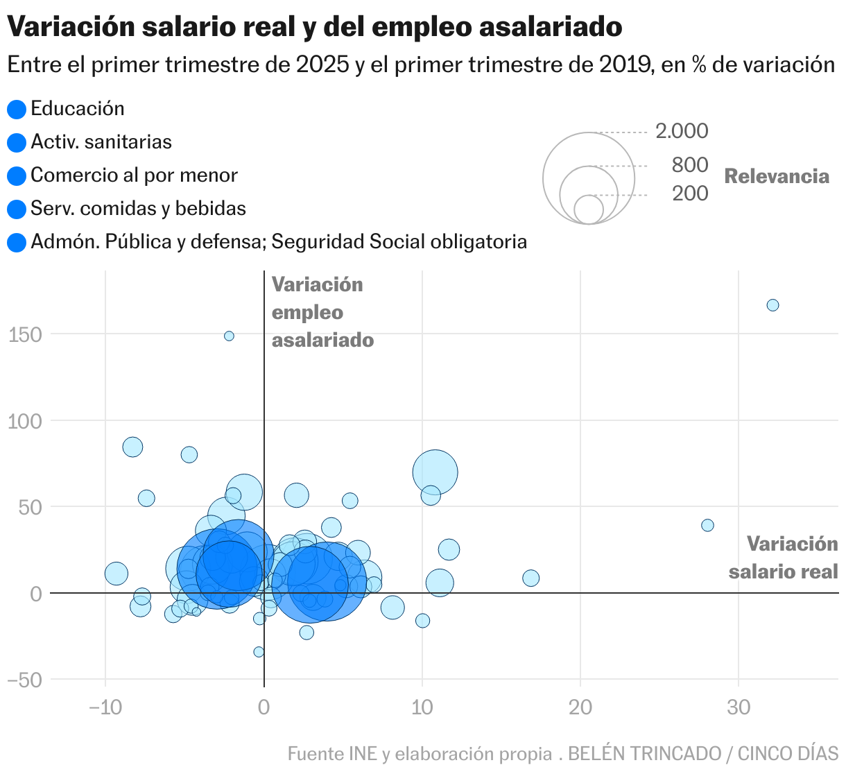 Así, por ejemplo, en un sector como servicios de información (el punto más alejado a la derecha y arriba de la figura) ha experimentado un aumento superior al 30% en los salarios reales de sus trabajadores, mientras su peso en la economía, medido como número de trabajadores, ha experimentado a su vez un aumento significativo. Sin embargo, su influencia en la evolución de los salarios medios españoles es muy pequeña, dado que aún solo el 0,1% de los trabajadores españoles están en ese sector.