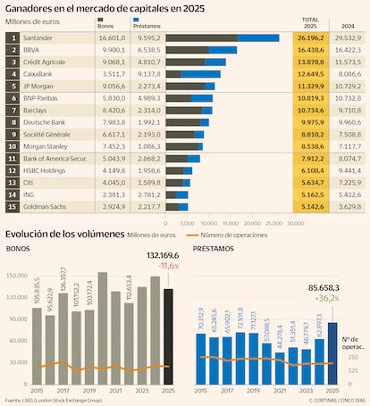 Por cuarto año consecutivo, Santander, BBVA y Crédit Agricole repiten en el podio de la actividad de mercado de capitales, la que sale de la suma del negocio de bonos y de préstamos, con la información recopilada por LSEG (London Stock Exchange Group).