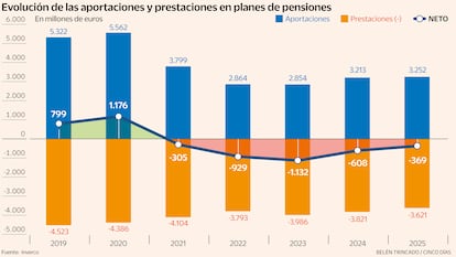 El enfermo evoluciona favorablemente, pero aún no sale de la UVI. Los planes de pensiones llevan cinco años consecutivos registrando más salidas de dinero que entradas. En 2025 fueron 369 millones de euros. La mejoría en las aportaciones a planes de colectivos (también llamados planes de empleo o empresariales) no ha bastado para taponar la sangría que padecen los planes de pensiones individuales.