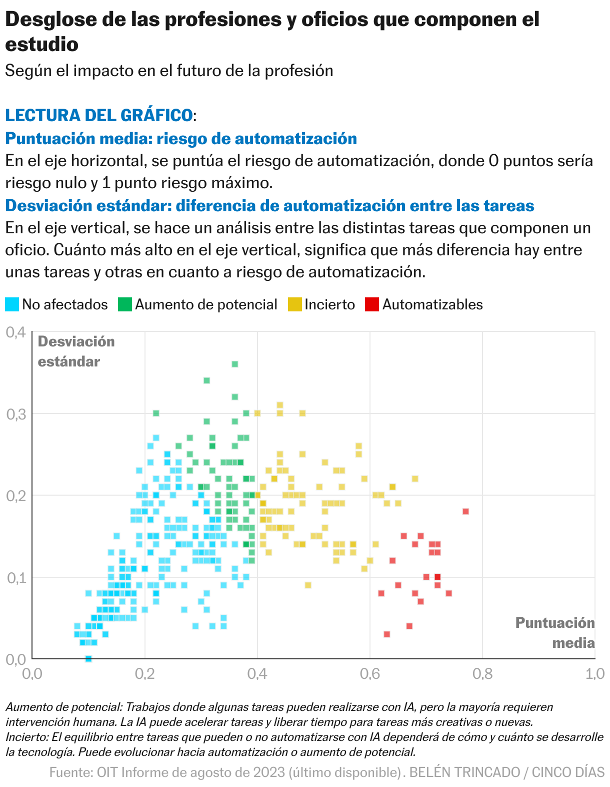 En enero de 2024, Kristalina Georgieva, directora gerente del Fondo Monetario Internacional, firmó un artículo en el que decía que el 40% de los empleos del mundo se verían afectados por la IA, en algunos casos, serían sustituidos, en otros, complementados. En agosto de 2023, la Organización Internacional del Trabajo publicó un análisis sobre qué empleos corrían más riesgo de ser automatizados y cuáles menos. Su análisis se realizó antes de la eclosión de los agentes IA y ya identificaban un 5% de oficios automatizables por completo en un momento en el que la IA estaba en una fase incipiente y los agentes eran algo más propio de la ciencia ficción que de la realidad.