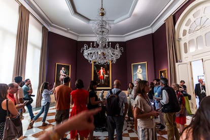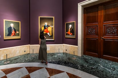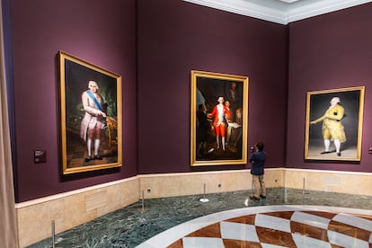 La joya del programa de visitas está al final del recorrido, en la sala Goya, donde se encuentran ocho retratos que pintó el genio aragonés, que fue accionista de la entidad, de “personalidades que fueron fundamentales en la creación del antiguo Banco Nacional de San Carlos [antecesor del Banco de España] en 1782”, ha explicado Romero. De los ocho lienzos, seis fueron encargos y dos se compraron en el siglo XX por el banco. Entre ellos destaca el del conde de Floridablanca (1783), en el que Goya se autorretrató de lado junto al protagonista del cuadro, un símbolo de su autoafirmación como artista. También el del conde de Cabarrús (1788), impulsor del banco, “amigo de Goya y representante de la burguesía ascendente”, ha añadido Romero, que, sin embargo, tras su auge tuvo una dramática caída al pasar cinco años en prisión.