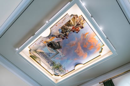También hay que mirar para arriba en una pequeña sala que se usó como comedor y en la que destaca una pintura de techo de Joaquín Sorolla, restaurada recientemente, que muestra a Voltaire contando un cuento a varias personas.