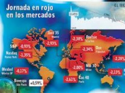 Nueva jornada de descensos en las Bolsas mundiales. El temor de los inversores a más problemas en el sector financiero y los malos datos económicos arrastraron a los mercados con fuerza. El Ibex perdió un 2,93% con acusadas caídas en el sector bancario y constructor.