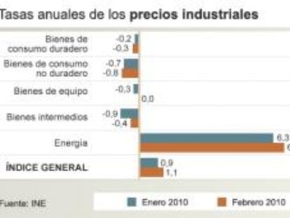Los precios industriales subieron el 0,2% en febrero respecto a enero y aumentaron el 1,1% frente al mismo mes de 2009, según los datos publicados hoy por el Instituto Nacional de Estadística (INE). De esta manera, encadenan su tercera subida interanual consecutiva.