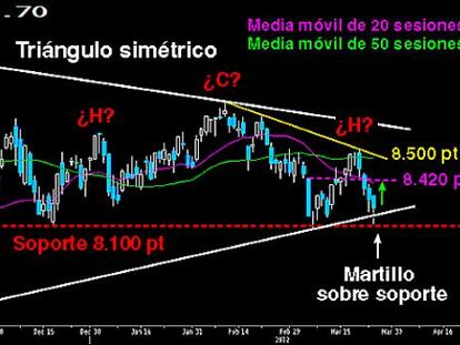 Los bajistas no cesaron en su ataque hasta dibujar un pullback completo en el Campeador, a escasos 33 puntos del último mínimo. Los alcistas iniciaron la defensa de su última trinchera en los 8.100 puntos.
