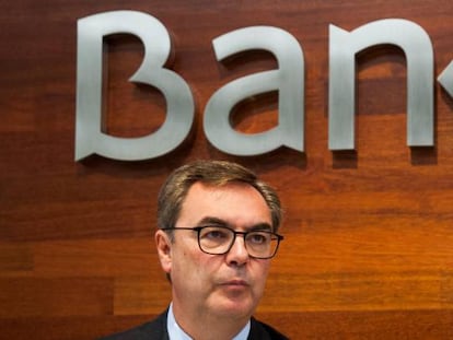 El consejero delegado del banco dice en Londres que la entidad no tiene previsto abordar una fusión pese a los tipos de interés en negativo