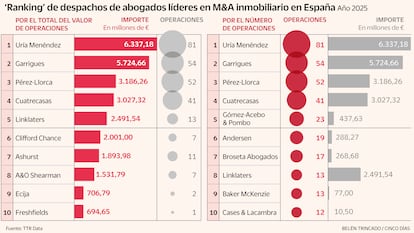 Este año ha servido para certificar la plena recuperación del mercado del M&A (fusiones y adquisiciones) inmobiliario en España, según coinciden todos los expertos consultados por CincoDías. Un periodo marcado por el apetito inversor por el ladrillo nacional: el capital sigue mirando con interés al residencial, los hoteles y las oficinas, activos que recuperan el protagonismo y empuje de antaño en el mercado. Ni siquiera el safety car que sacó a pista Donald Trump a primeros de año en forma de aranceles ha frenado el burbujeo de operaciones en el sector. En 2025, el top 10 de despachos superó en 66 transacciones a lo registrado en 2024. “Los datos de TTR Data confirman que el sector inmobiliario ha sido el protagonista del mercado de M&A en España en los últimos años”, asegura Marcela Chacón, portavoz de la plataforma.