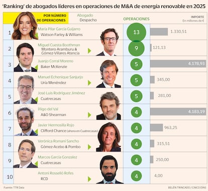 Los abogados especializados en energía y derecho mercantil desempeñan un papel central en este entramado: no solo asesoran en transacciones complejas —muchas de ellas cross-border— y estructuran operaciones financieras, sino que también facilitan la convergencia entre regulaciones, inversores y desarrolladores. CincoDías publica el primer ranking de los abogados dealmakers (con categoría de socios) que han liderado estas operaciones en el sector de energía renovable en 2025, según la plataforma TTR Data. Una clasificación individual que complementa el Top 10 de bufetes en la que brillan con luz propia Íñigo del Val (A&O Shearman) y María Pilar García Guijarro (Watson Farley & Williams) liderando un ranking de alto voltaje.