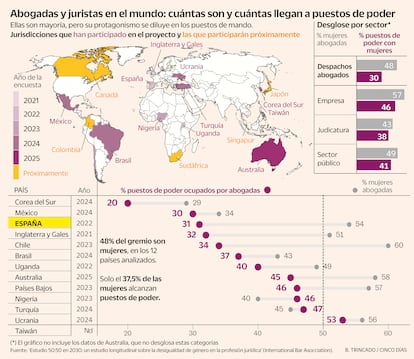 La ausencia de mujeres en puestos directivos trasciende las fronteras españolas. La fotografía se repite en prácticamente todos los mercados legales del mundo. En 2021, la International Bar Association (IBA, la mayor asociación de abogados a nivel global) puso en marcha un ambicioso proyecto para estudiar, país por país, el avance del liderazgo femenino en los 200 mejores despachos de abogados. Desde entonces ha analizado 13 territorios y las conclusiones son claras: de media, solo el 30% de las abogadas llega a ocupar un alto cargo en un bufete. En España, la proporción de mujeres en el poder es similar al promedio global. Los datos de Australia, último territorio analizado, son más positivos: el 45% ocupa un sillón directivo.