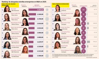 En España, el mercado transaccional registró en 2025 una actividad inferior a la del año anterior. En este contexto, el ejercicio ha dejado una buena cosecha de operaciones lideradas por un grupo de 38 abogadas —17 socias y 21 asociadas— que se consolidan como referentes del M&A (fusiones y adquisiciones). Por firmas, en el cómputo global Garrigues encabeza la lista con siete mujeres reconocidas, seguido de Pérez-Llorca con seis y Uría Menéndez con cuatro. En la categoría de rising stars casi se repite la foto: lidera Garrigues, con cinco abogadas, seguido de Pérez-Llorca, con cuatro, y Uría, con tres abogadas, el mismo número de profesionales que posiciona A&O Shearman.