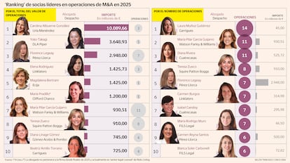 En la semana de la mujer, CincoDías publica la segunda edición del ranking de las socias y counsel dealmakers que reinan en M&A, según TTR Data. Es la primera ocasión en la que se incluye una tabla con rising stars, abogadas con categoría de asociadas. Una clasificación que nació hace seis años para visibilizar la labor de las mujeres en las grandes transacciones. La evolución es clara: “Lo que en sus primeras ediciones era una fotografía limitada, hoy refleja una realidad estructural; cada vez más mujeres lideran operaciones complejas, participan en mandatos estratégicos y ocupan posiciones clave en los equipos que asesoran las transacciones de mayor valor en España”, comenta su portavoz, Marcela Chacón. “Para TTR Data, este no es un discurso coyuntural ni una tendencia de moda. Es una constatación basada en el análisis objetivo del mercado, lo que nos permite medir la progresión real del liderazgo femenino en M&A con criterios estrictamente profesionales”, subraya.