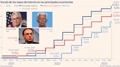 La previsión mayoritaria es que la Reserva Federal estadounidense elevará los tipos de interés en su cita de mayo en 25 puntos básicos, hasta una horquilla del 5%-5,25%, para echar ahí el freno. Para el BCE, el consenso está más dividido entre esperar un incremento de 25 o de 50 puntos básicos. Christine Lagarde aún podría reservarse dos alzas de tipos más, en junio y julio, hasta estar convencida de haber embridado por fin la inflación.