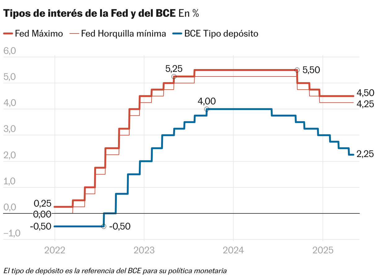 La reunión se celebra también con los ecos del último ataque (también con retirada incluida) de Trump al propio Powell. A mediados del mes pasado, el presidente reaccionó a la expectativa de una bajada de los tipos del Banco Central Europeo arremetiendo contra el presidente de la Fed, “que siempre llega demasiado tarde y se equivoca”, dijo. “El cese de Powell no puede llegar lo suficientemente rápido”, escribió Trump en un mensaje en su red social, Truth. La ley no permite al presidente de Estados Unidos despedir a Powell antes de que llegue el final de su mandato, en mayo de 2026, aunque nunca se sabe, en vista de las ganas de ampliar el poder ejecutivo de las que hace gala la actual Administración.