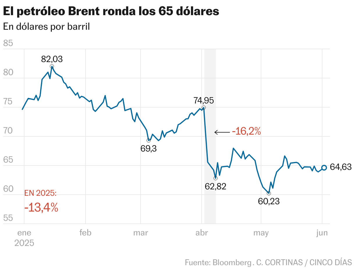 El barril de petróleo Brent ronda hoy los 65 dólares, con un alza que ha llegado a superar el 3%, mientras que el barril de crudo West Texas se encarece hasta los 63 dólares, con un alza que ha llegado a ser del 5%, la mayor desde abril. El precio del crudo repunta tras un retroceso superior al 2% durante la semana pasada, que concluyó además con la posibilidad de que la OPEP decidiera para julio un incremento de producción superior al de meses atrás. Finalmente, el cartel petrolero optó en su reunión del sábado por continuar con la aceleración de su producción, aunque al mismo ritmo de los dos meses anteriores. Es decir, su producción para julio aumentará en la misma cuantía pactada para mayo y junio, en 411.000 barriles diarios. La OPEP + se queda por tanto ya a mitad de camino en su plan de reactivar los 2,2 millones de barriles diarios de suministro.