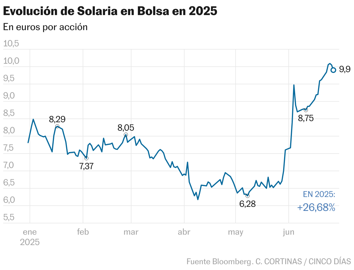 Vuelco en rentabilidad para los accionistas de Solaria. A falta de una sesión para que termine junio, se ha revalorizado el 31% en el mes dejando el balance anual en una ganancia del 27% (llegó a perder el 21%). El avance, además, se ha producido con un repunte de la negociación; en el primer semestre se han intercambiado 194,87 millones de títulos, el 90% de lo que hizo en todo 2024, según datos de BME. El salto de la cotización ha llegado con la presentación de los resultados del primer trimestre de 2025, que arrojaron un beneficio histórico de 53,4 millones.