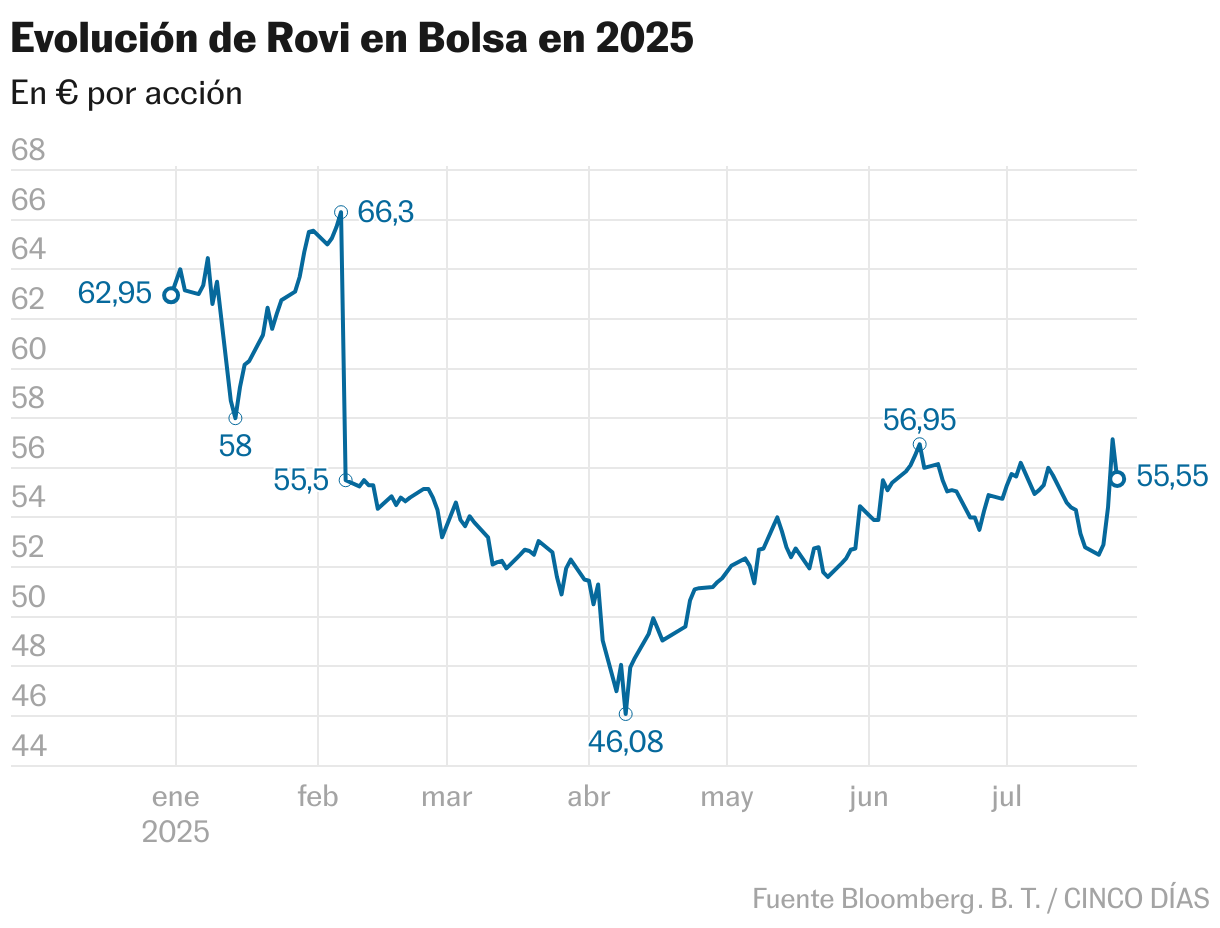 Rovi ha presentado resultados esta semana que han dado un respiro a la cotización. El laboratorio madrileño rebotó el 5% el jueves después de comunicar a la CNMV unas cuentas en el primer semestre que reflejan una caía del beneficio del 10%, y una la desaceleración de la división de fabricación a terceros (CDMO) ante una menor demanda de vacunas de Covid que desarrolla para Moderna. La parte positiva estuvo en el área de especialidades médicas, con las ventas creciendo el 13%, y en la confirmación de las previsiones para 2025 (disminución de los ingresos entre 0% y 10% sobre 2024). “La reacción alcista ha sido algo exagerada teniendo en cuenta las cifras de la compañía, pero parece que la confirmación de las estimaciones y el crecimiento de Okedi [fármaco indicado para el tratamiento de la esquizofrenia en adultos] han convencido a los inversores”, explican desde XTB.