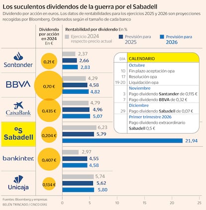 La entidad catalana, en su esfuerzo por la supervivencia como banco independiente, decidió activar un dividendo extraordinario de 2.500 millones de euros procedentes de la venta de su filial británica, TSB, al Banco Santander. Por cada acción, repartirá 0,5 euros en el primer trimestre de 2026 entre aquellos accionistas que no vendan sus títulos al BBVA. Esta cifra, que por sí sola equivale al 15% del valor de mercado del banco, se sumará a los dividendos que entregue de manera ordinaria y que, al menos, alcanzarán los 1.450 millones de euros. Como parte de los pagos ordinarios, el próximo 29 de diciembre, el Sabadell ya ha concretado que desembolsará 0,07 euros por cada acción.