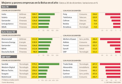 Al final de cada año, el balance bursátil deja una clara división entre los valores estrella que se han ganado el favor del mercado y los estrellados que han perdido la confianza de los inversores. 2025 no ha sido la excepción. En España, y en Europa, quien apostara por el sector bancario y el de defensa habrá visto cómo su cartera se disparaba. En Estados Unidos la tecnología ha vuelto a dejar ganancias en la renta variable, aunque algo desiguales, mientras que el consumo ha sido el gran perjudicado de unas tensiones comerciales iniciadas por el nuevo gobierno de Donald Trump.