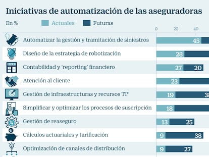 Las empresas solo prevén un fuerte impacto de esta tecnología a más de tres años vista y avanzan pocas inversiones hasta entonces Administración de pólizas, gestión de siniestros y atención al cliente, áreas más susceptibles de automatizar