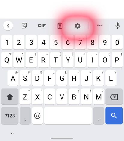 - Verás ahora el teclado en la pantalla y, en la zona superior, hay un icono con forma de engranaje que te permite acceder a la Configuración. Dale uso de forma habitual. En caso de no verlo, en el mismo lugar verás tres puntos horizontales, pulsa en ellos y verás el elemento que hemos comentado.