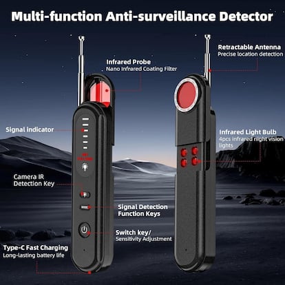 De esta manera, este equipo no solo te servirá para verificar que la habitación de hotel está libre de cámaras ocultas, sino que también sirve para saber si están rastreando tu coche entre otros. Un completo detector 4 en 1 que tiene un precio que no supera los 35 euros y que ofrece un formato compacto y un peso de tan solo 30 gramos.