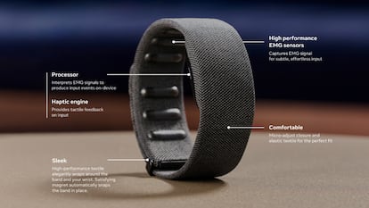 El otro gran avance es la Meta Neural Band, una pulsera que traduce la actividad eléctrica de los músculos, mediante tecnología EMG, en comandos digitales. Con ella, es posible hacer scroll, seleccionar opciones o ajustar el volumen con simples movimientos de los dedos, sin necesidad de tocar las gafas ni el móvil.