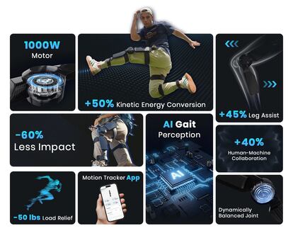 Además, aporta un refuerzo del 45% en la zancada, lo que se traduce en pasos más enérgicos y una sensación general de ligereza, incluso cuando llevas una mochila cargada hasta arriba. La marca habla también de un 50% más de conversión de energía cinética y de una colaboración humano-máquina mejorada en torno al 40%. Unos números muy atractivos.
