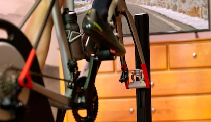 Esta es una de las grandes novedades de la marca, ya que hablamos de un dispositivo que cambia las reglas del juego en la inmersión vertical. Hasta ahora, las subidas en rodillo eran puramente una cuestión de resistencia magnética: las piernas trabajaban más, pero la bicicleta permanecía horizontal. Tacx Alpine es un simulador de gradiente diseñado para elevar y descender físicamente el tren delantero de la bicicleta, replicando la geometría real de la escalada. Este dispositivo es capaz de simular pendientes positivas de hasta un 25% y descensos de hasta un -10.