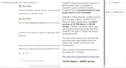 Esta extensión servirá de “chivato”. En el momento en el que superes los 24.000 tokens, comienzan las curvas y ChatGPT cae en términos de rendimiento. Y para saberlo, solo tienes que abrir la extensión. En la imagen que hay sobre estas líneas, donde he mantenido conversaciones con un chatbot especializado en mascotas, verás que he superado ampliamente ese límite, superando los 73.000 tokens, por lo que está claro que esa conversación no fluirá bien.