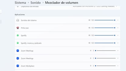 Por ello, la forma más efectiva de asegurarte de que no escuchas nada es bajar a cero todas las entradas que contengan el icono o el nombre de Zoom. Si solo silencias una, puede ocurrir que un nuevo usuario empiece a hablar y Zoom abra otra instancia de audio que vuelve a generar sonido. Bajar todas garantiza que no te sorprenda ninguna voz inesperada a mitad de tu canción favorita o en ese correo que necesitas escribir sin distracciones.