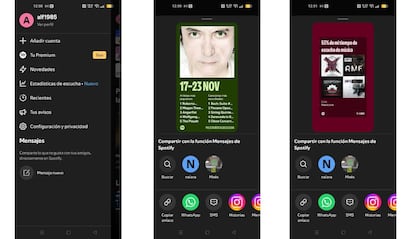 Además, una vez entres en esta sección, verás que hay un botón de compartir. Solo tienes que pulsar el servicio que quieras usar, WhatsApp, Gmail u otros, y compartir con los tuyos tus estadísticas de escucha en Spotify.