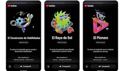 Como te hemos dicho, es bastante completo. Al punto de que el YouTube Recap puede incluir hasta doce tarjetas distintas. Verás información sobre tus creadores de contenido de referencia, tus tendencias personales, tus temas recurrentes e incluso hay una categoría que probablemente se convertirá en la más comentada: la personalidad que define tu forma de ver YouTube.