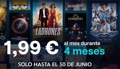 “Oferta válida hasta el 30/06/2025 a las 23:59. Solo para nuevos suscriptores de Disney+ y antiguos suscriptores de Disney+ sin una suscripción activa. Deben ser mayores de 18 años. Al canjear esta oferta, te suscribirás a una suscripción mensual que se renovará automáticamente y se te cobrará el precio del plan Estándar con anuncios vigente en ese momento (actualmente 5,99 €) cada mes a partir del final de tu oferta promocional de 4 meses, a menos que canceles tu suscripción antes. Puedes cancelarla cuando quieras, en cuyo caso la cancelación surtiría efecto al final de tu periodo de facturación. No se ofrecen reembolsos ni créditos por meses parciales. Para disfrutar de esta oferta, crea o inicia sesión en una cuenta de Disney+ y acepta el Contrato de suscripción a Disney+. Es necesario un método de pago válido para canjear la oferta. No es acumulable a otras ofertas, cupones, descuentos o promociones. No es canjeable por dinero en efectivo ni por ningún otro producto o servicio. Los requisitos para optar a esta oferta y su duración pueden variar si te suscribes a través de un tercero."