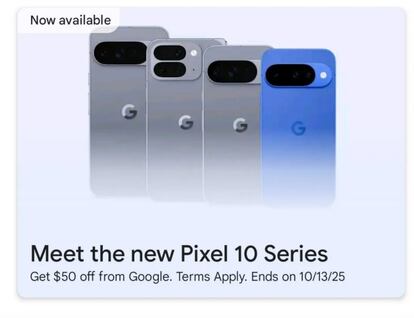 Además, en la imagen vemos que ofrece una promoción de descuento de 50 euros al adquirir cualquiera de los modelos. Seguramente un vale para compras dentro de la tienda de Google y que te permitirá acceder a auriculares, fundas y otros complementos con descuento. Aunque también puede ser un descuento directo en el precio de los Pixel 10, Pixel 10 Pro, Pixel 10 Pro XL y Pixel 10 Pro Fold.