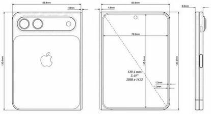 Con unas dimensiones de 83,8 milímetros de ancho y 120,6 milímetros de alto, el dispositivo plegado sería más compacto en altura que un iPhone actual, pero también más cómodo de guardar en el bolsillo y de usar con una sola mano, así que Apple vuelve a apostar por la mejor experiencia de uso.
