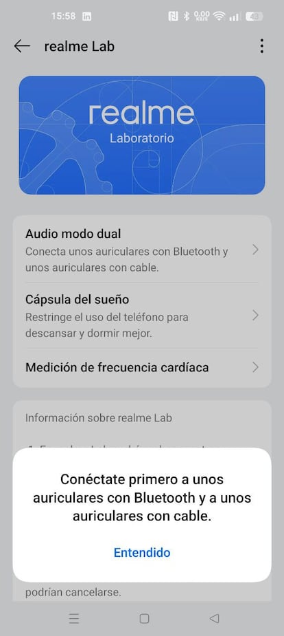 - Desplázate hasta el apartado Realme Lab. Dentro encontrarás la opción Audio modo dual.